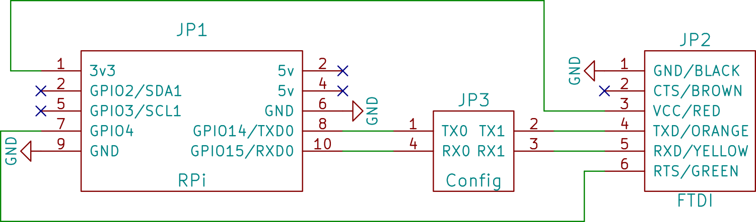 The circuit is fairly basic. One 5x2 connector for the Raspberry Pi, one 6x1 connector for the FTDI adapter and two jumpers to configure if the serial data points are connected RX to TX, to enable communication with the Pi, or TX to TX and RX to RX, to enable communication with an add-on board.